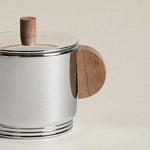 Mid-century chrome sugar and creamer set with oak handles and finials. The sugar bowl features dual wooden side handles and a matching domed lid, while the creamer has a single handle with a spout and round wooden finial. The combination of bright chrome with warm oak accents reflects Scandinavian-inspired design sensibilities of the 1950sā60s.