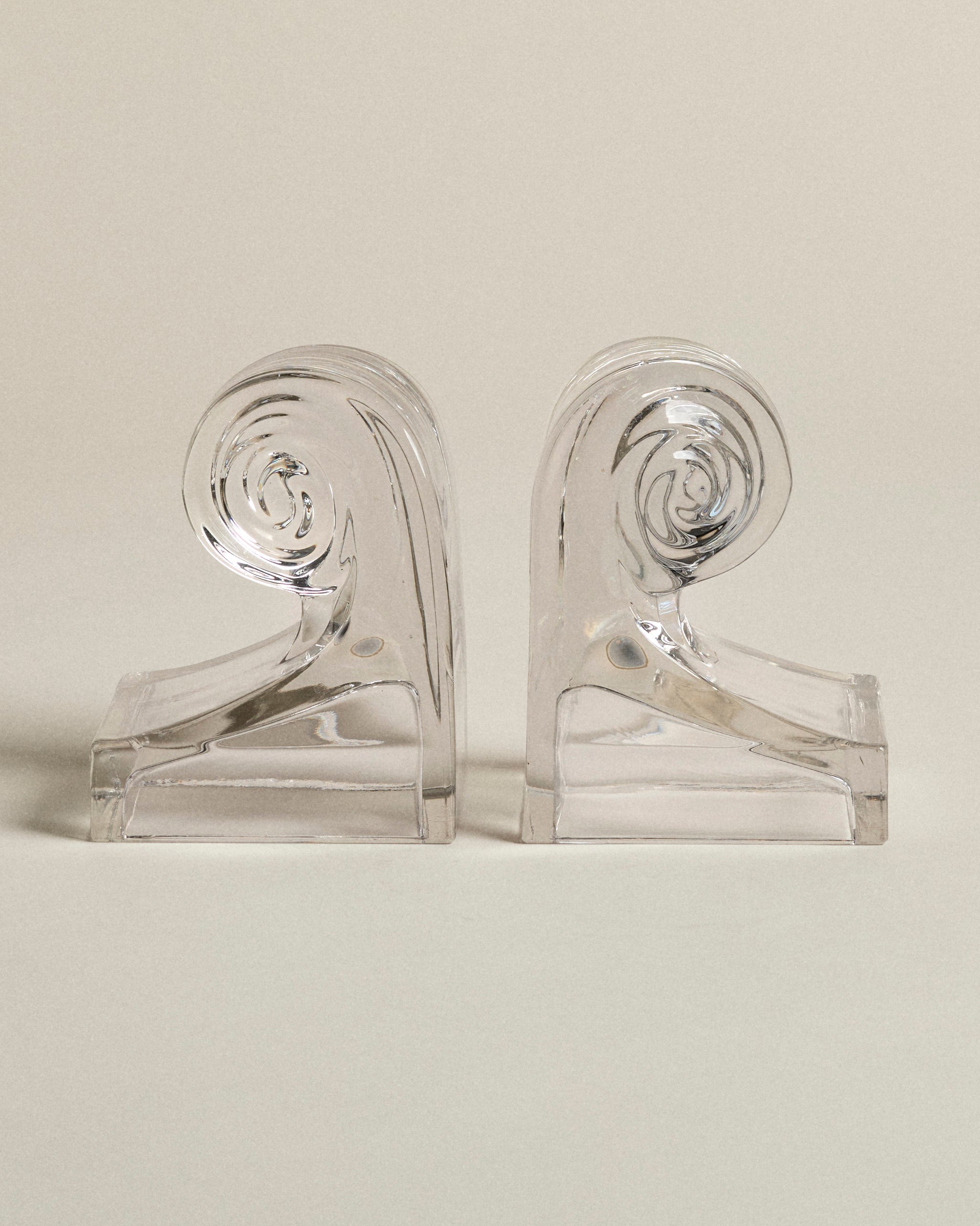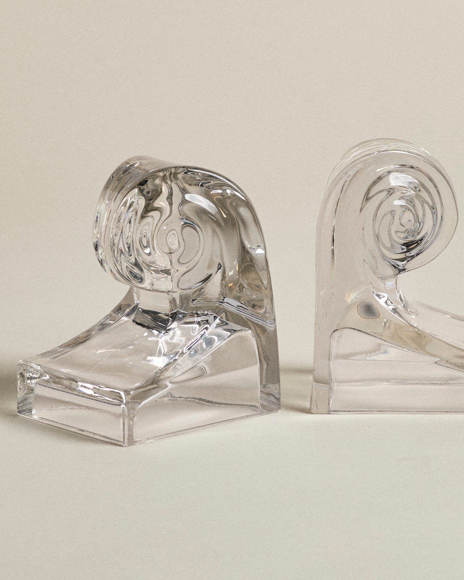 Pair of vintage Art Deco glass bookends, each modeled as a bold scroll in clear glass, often referred to as the “wave” form. The geometric base and curling volute capture the streamlined elegance of 1930s design, making them as decorative as they are functional.
