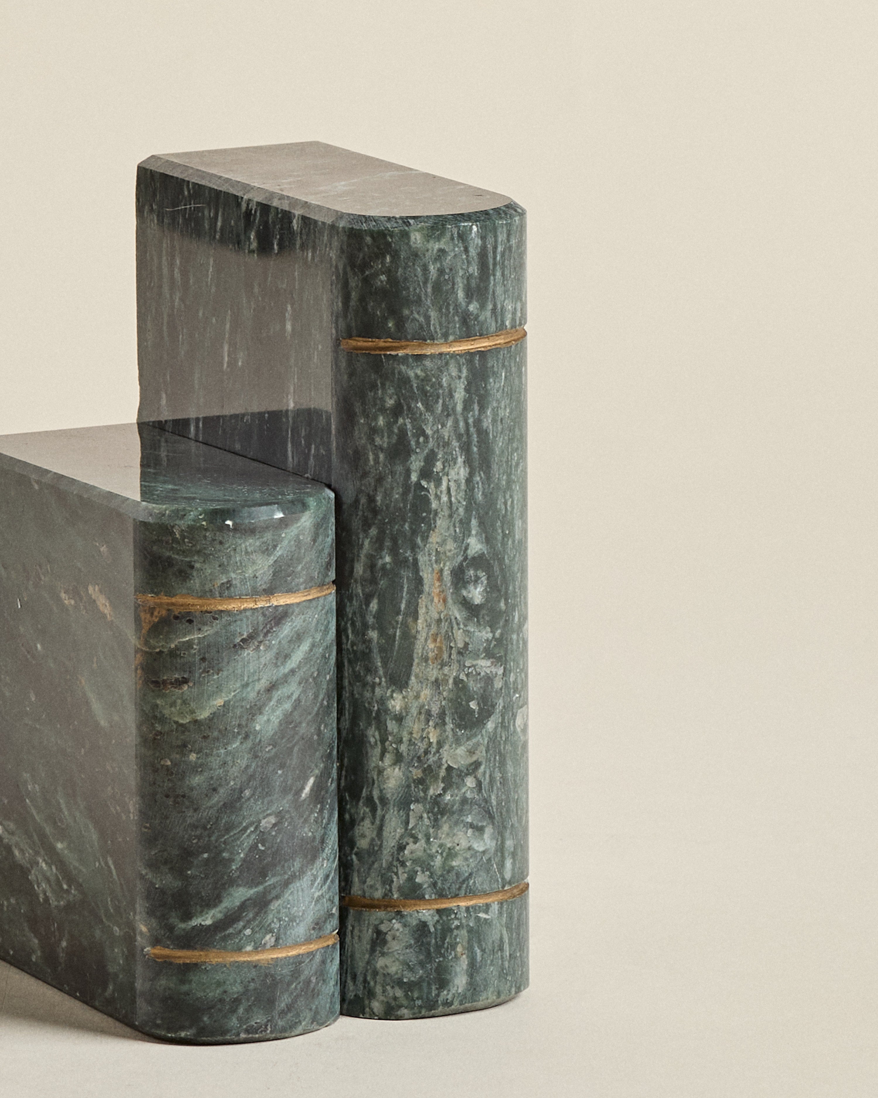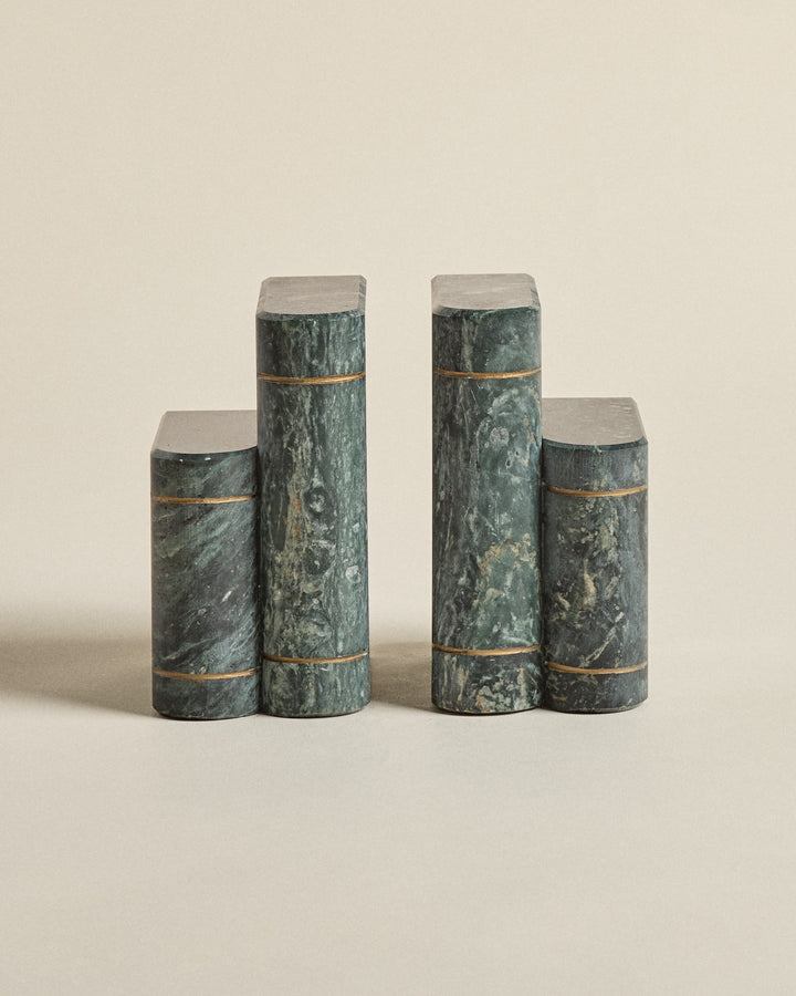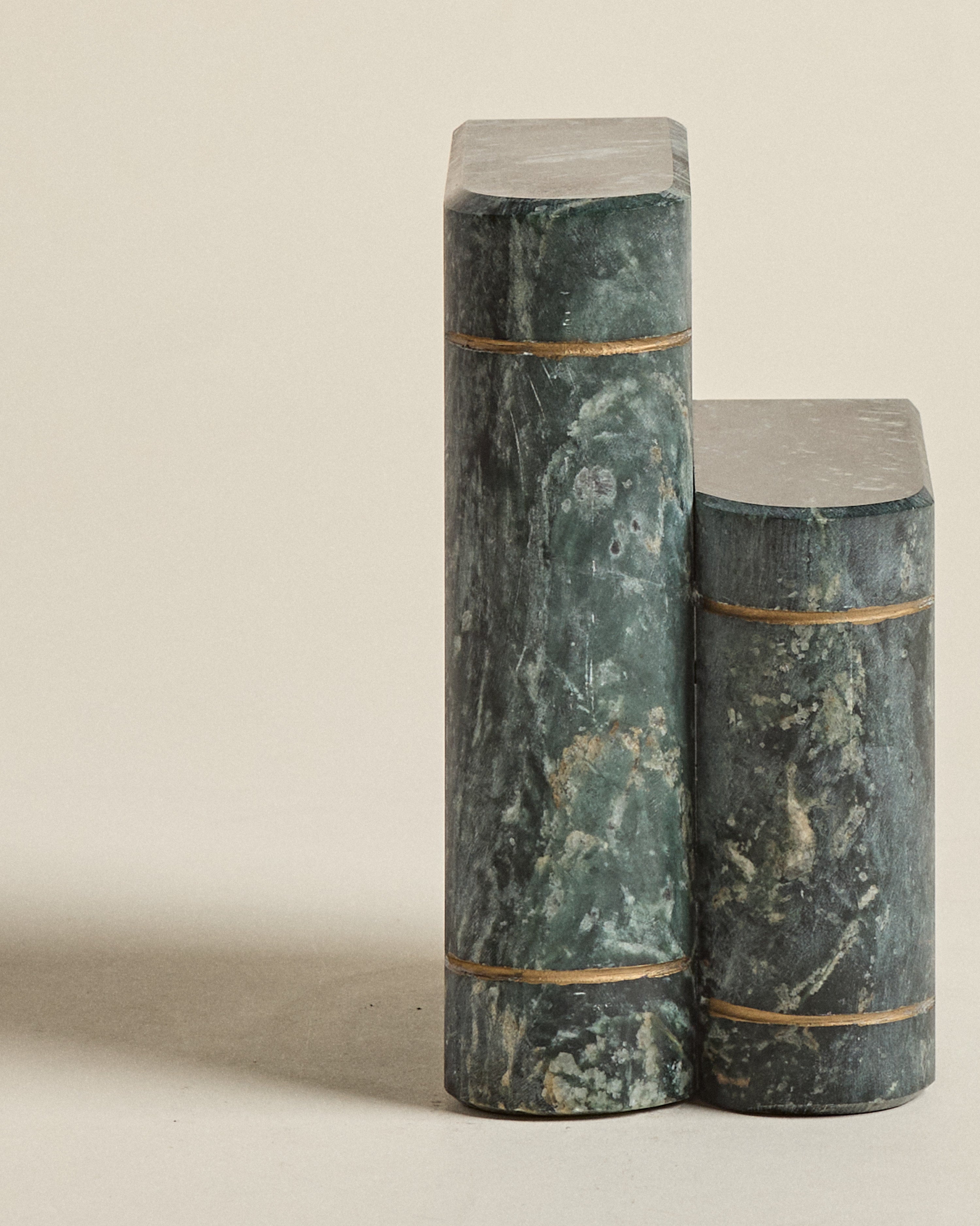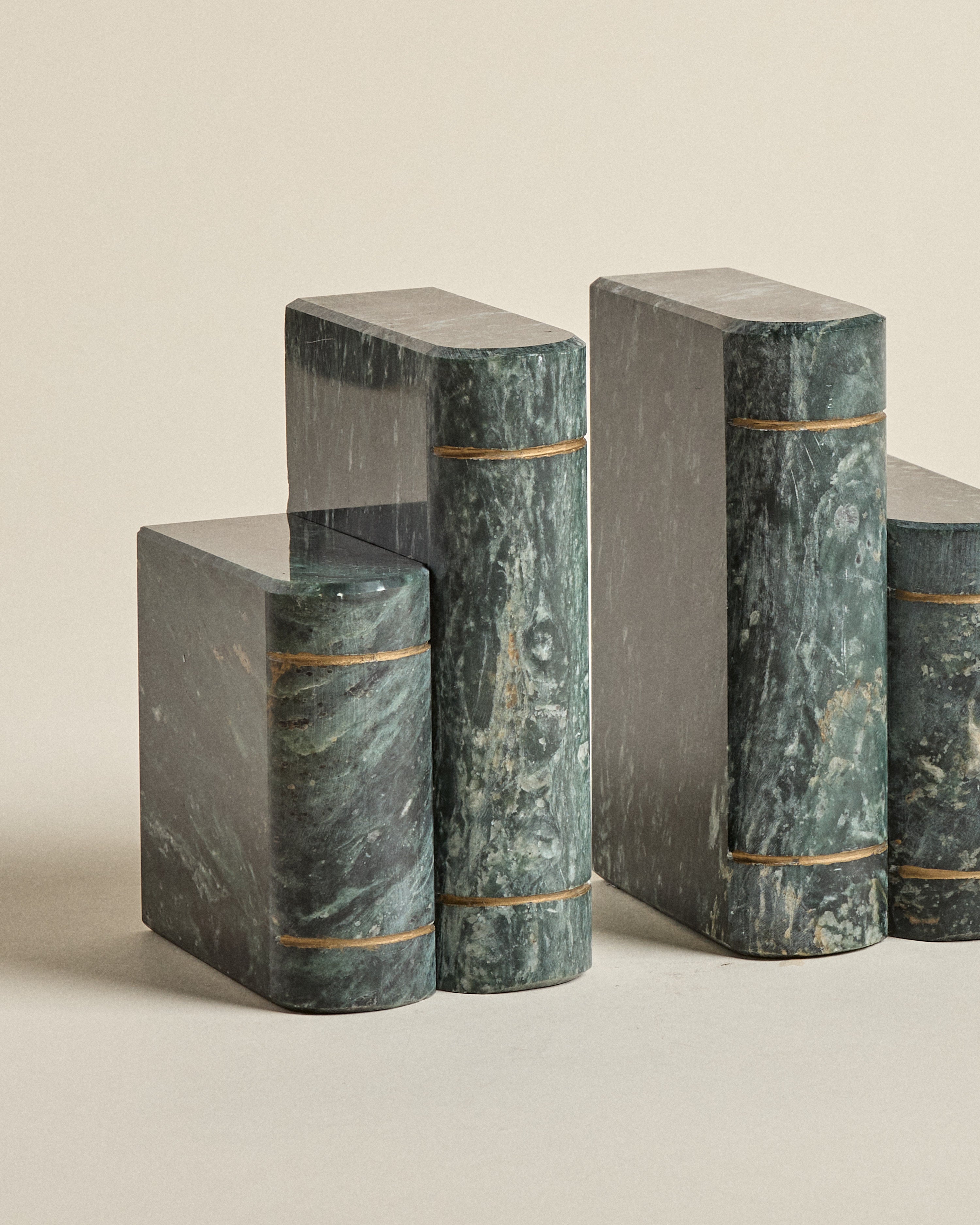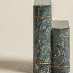 Pair of vintage green marble bookends carved in the form of upright books with rounded spines and subtle gilt accent bands. The rich green stone features natural veining throughout, lending depth and variation to each piece. Substantial in weight and presence, these bookends embody both sculptural elegance and functional design, making them ideal for a refined library, office, or curated interior.