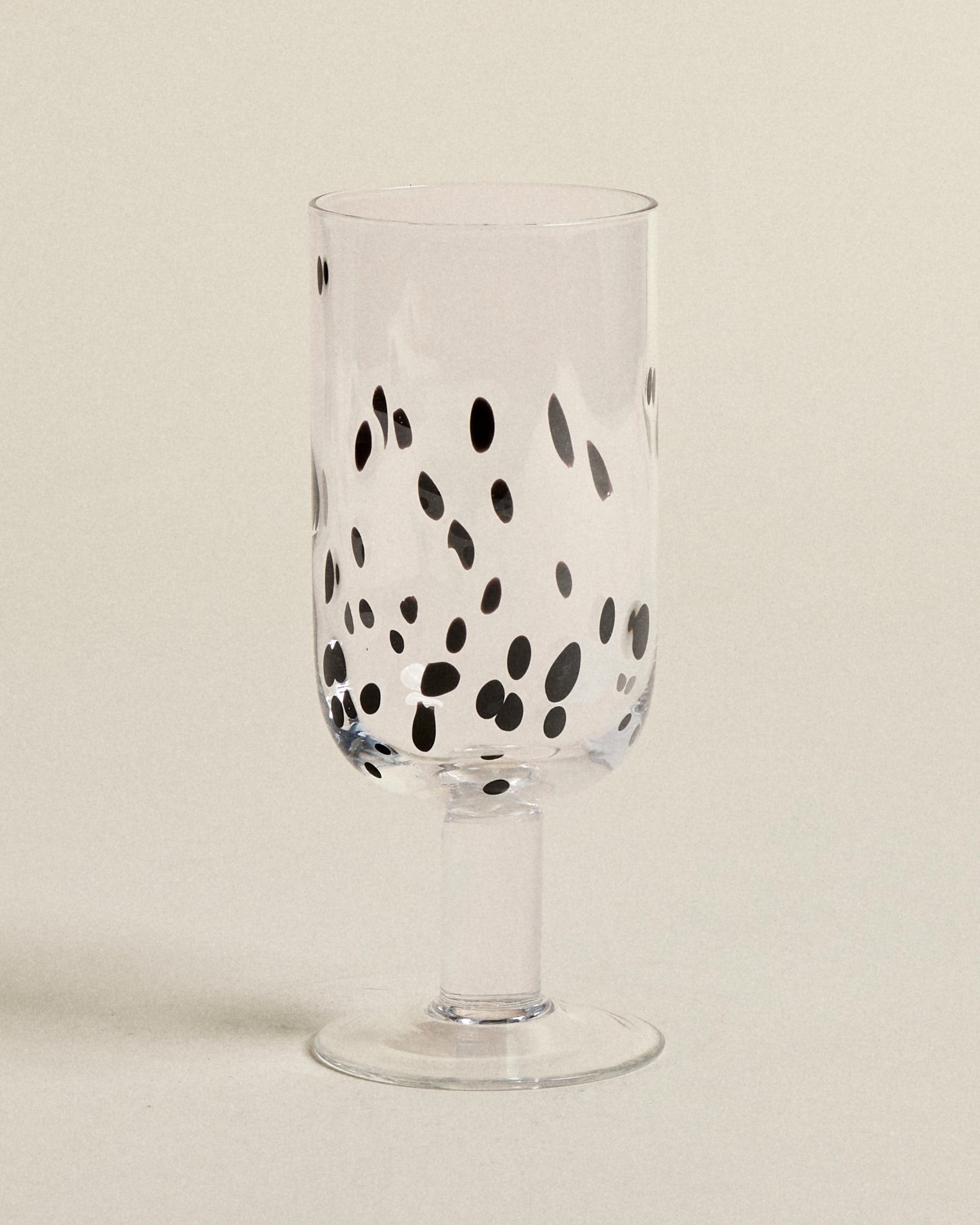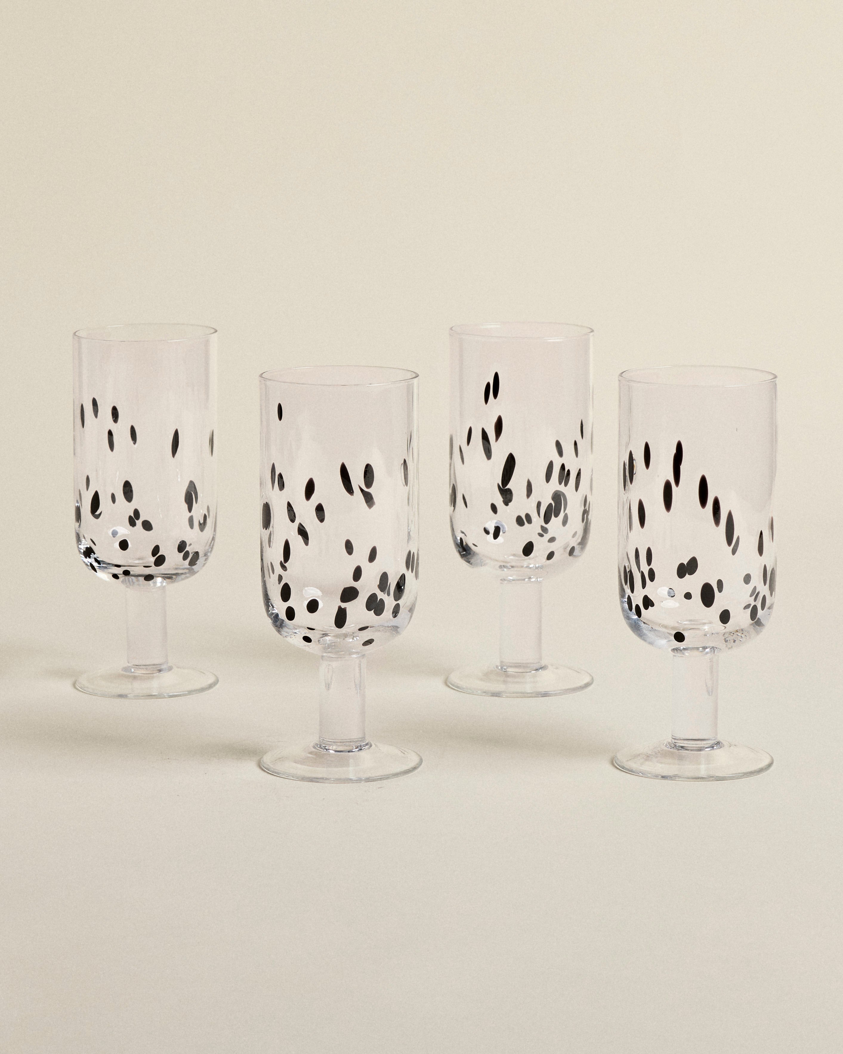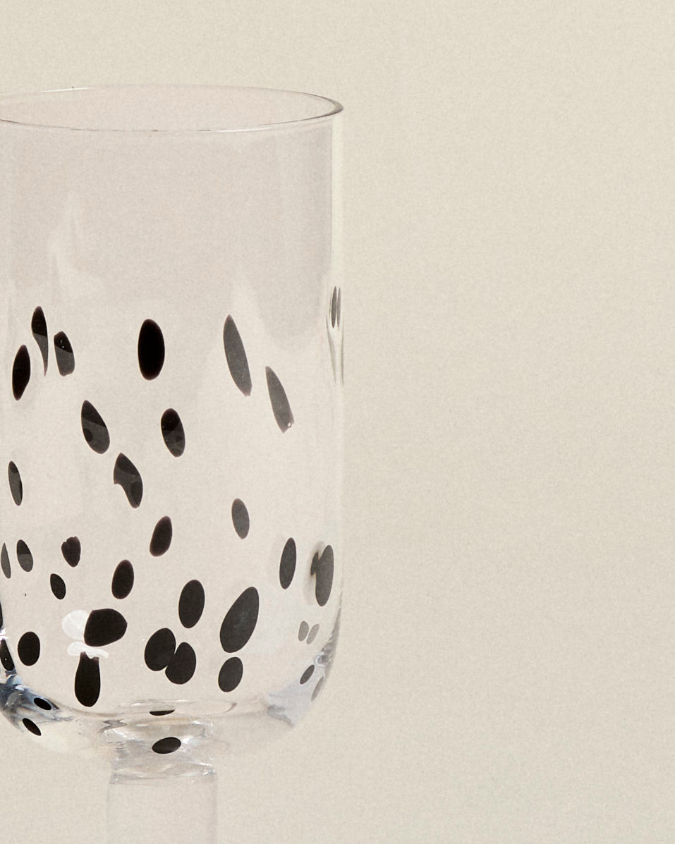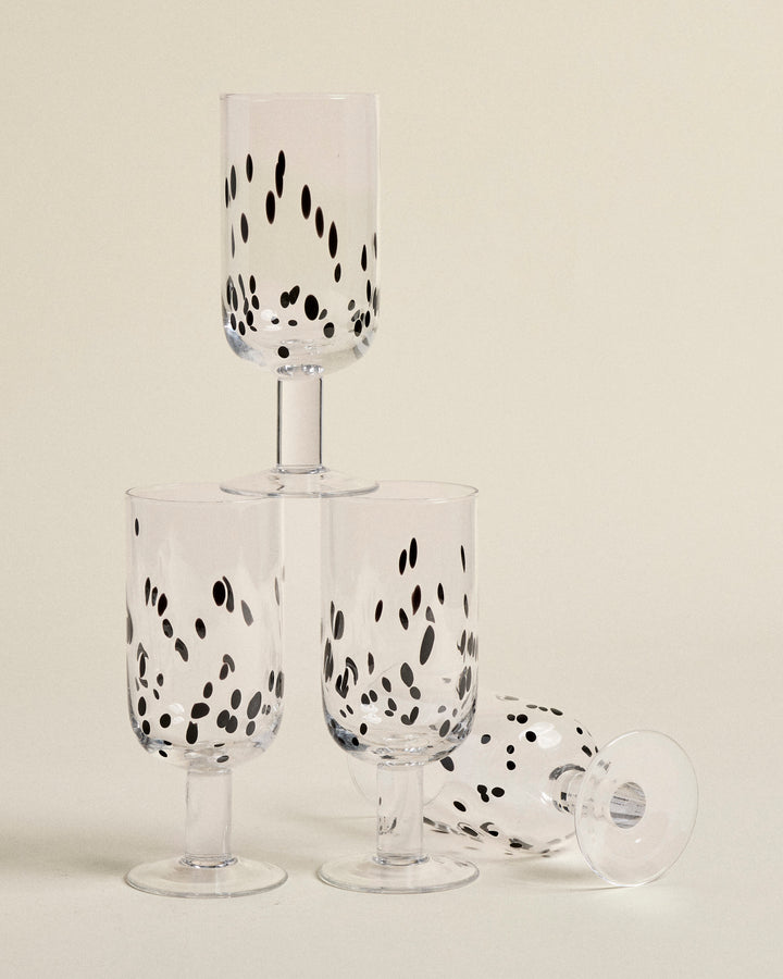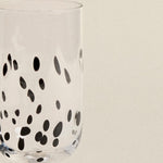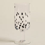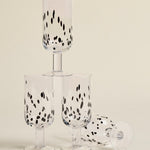 Set of four hand-blown Murano-style goblets with bold black spot decoration. Each glass is individually crafted, featuring unique organic spotting against clear glass and supported by a sturdy stem and base. The playful yet refined design captures the spirit of mid-century Italian art glass, making them ideal for use as wine or water goblets — or as striking decorative pieces for a bar or table setting.
