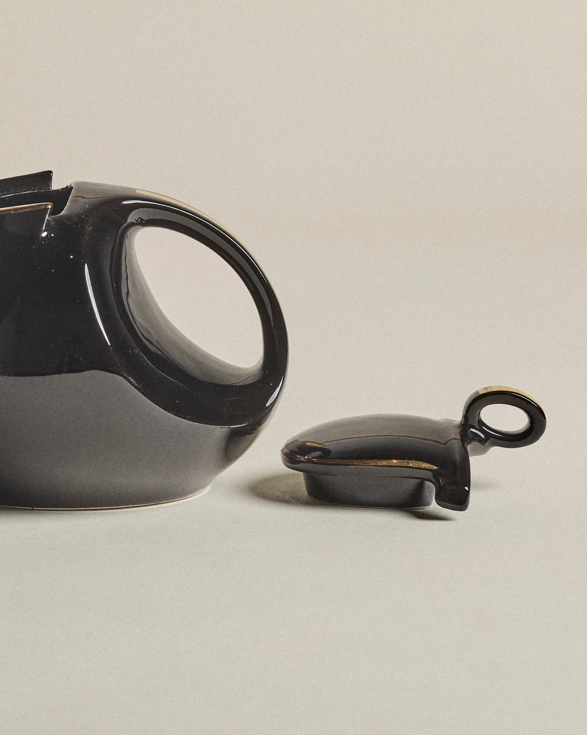 Mid-century black ceramic teapot by Hall, with glossy glaze and gilt accents. Produced in the 1940s, the design reflects the streamlined modern forms of the period, with a circular handle and domed lid lending sculptural balance.
