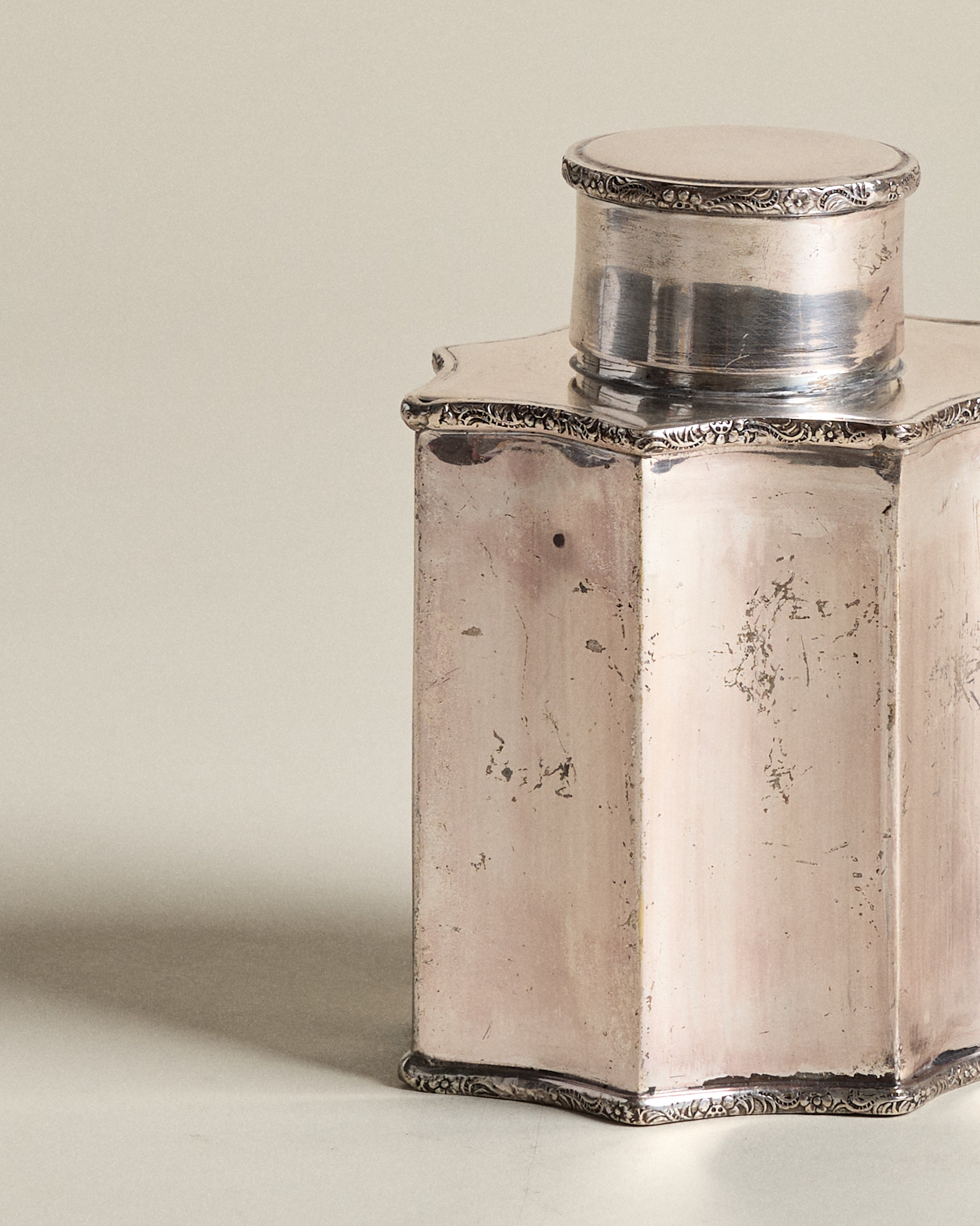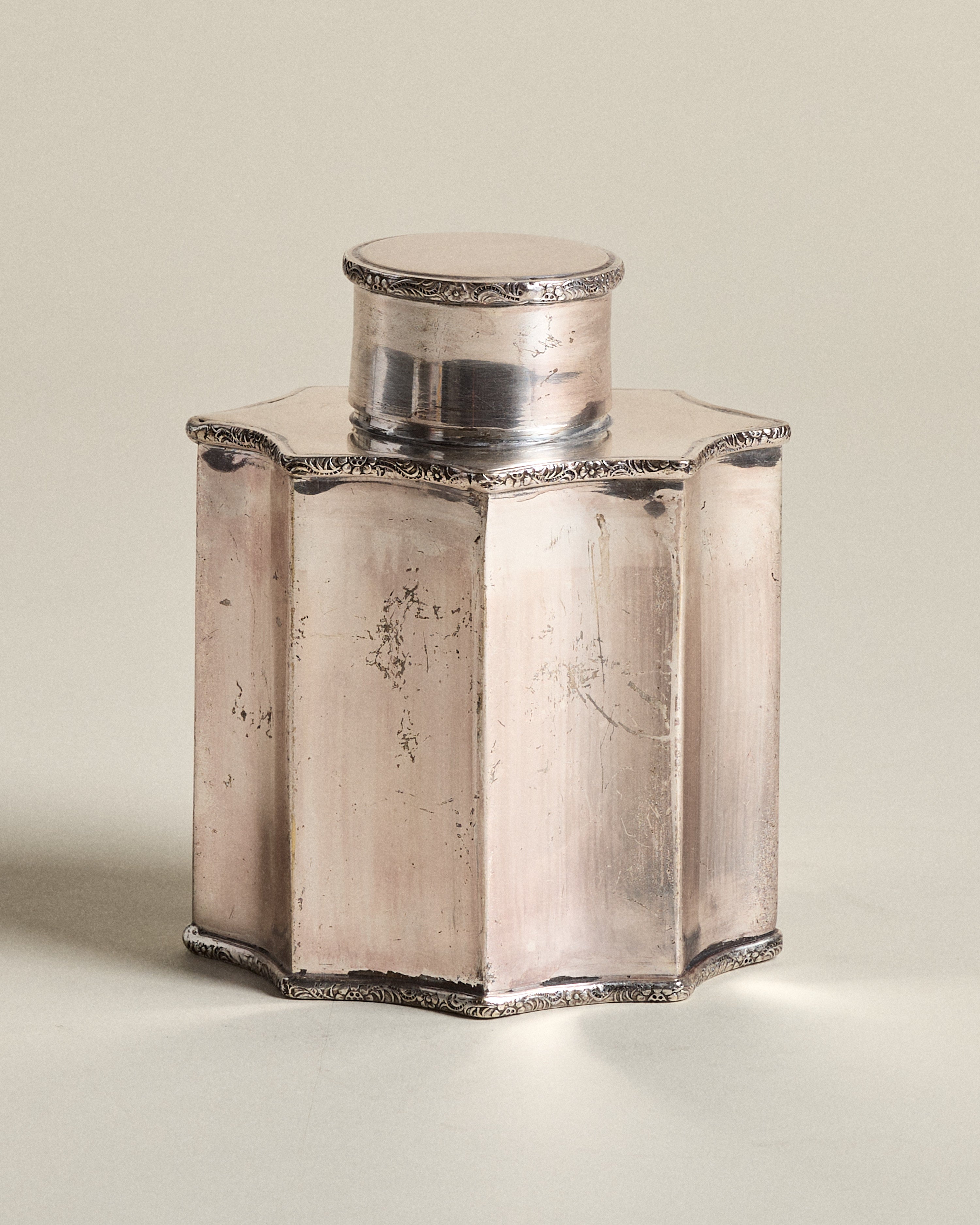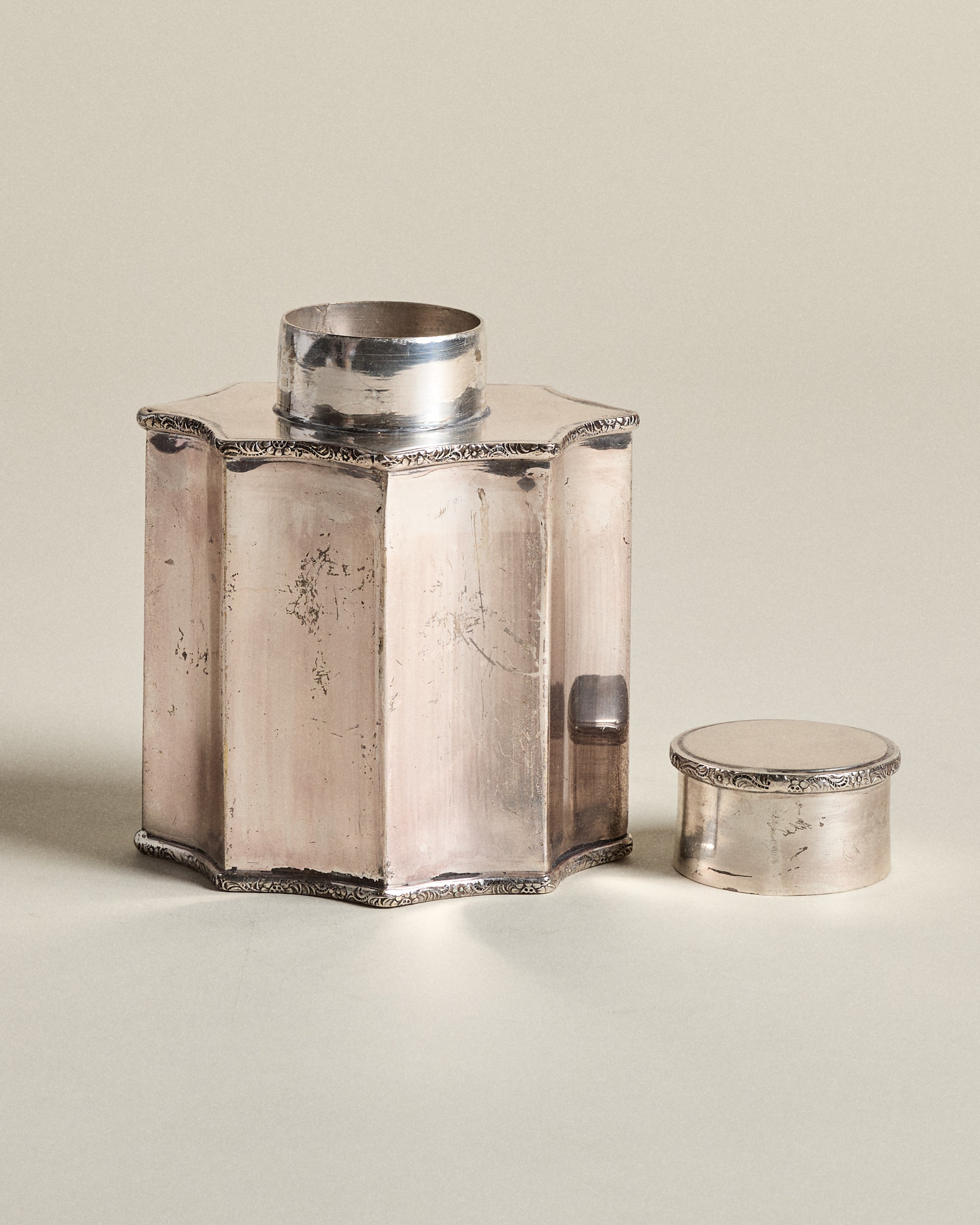 Vintage silver plate tea caddy with scalloped sides and fitted lid, edged with engraved figural scrollwork. Likely mid-20th century, this canister-style form reflects the elegance of traditional tea storage.