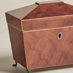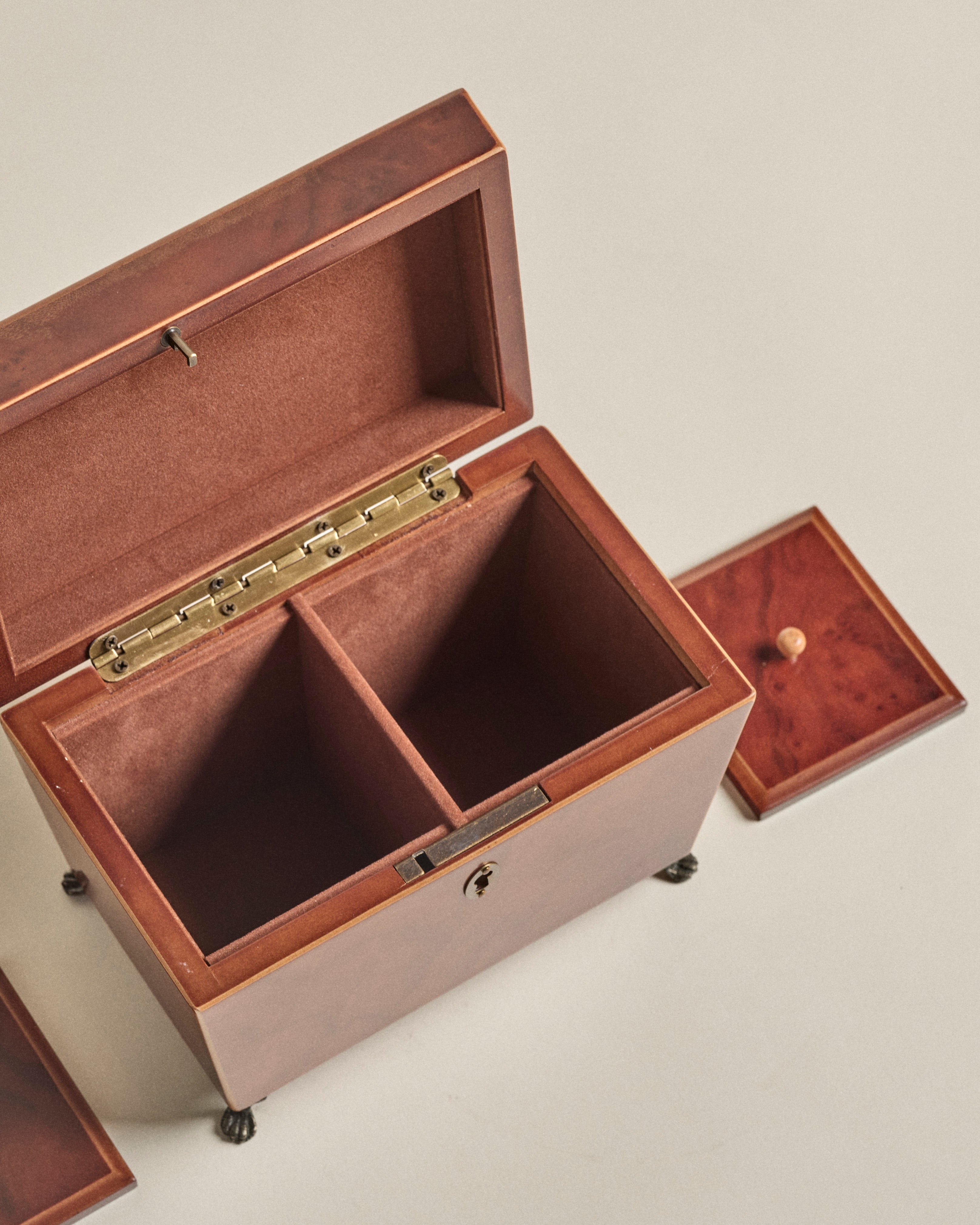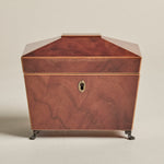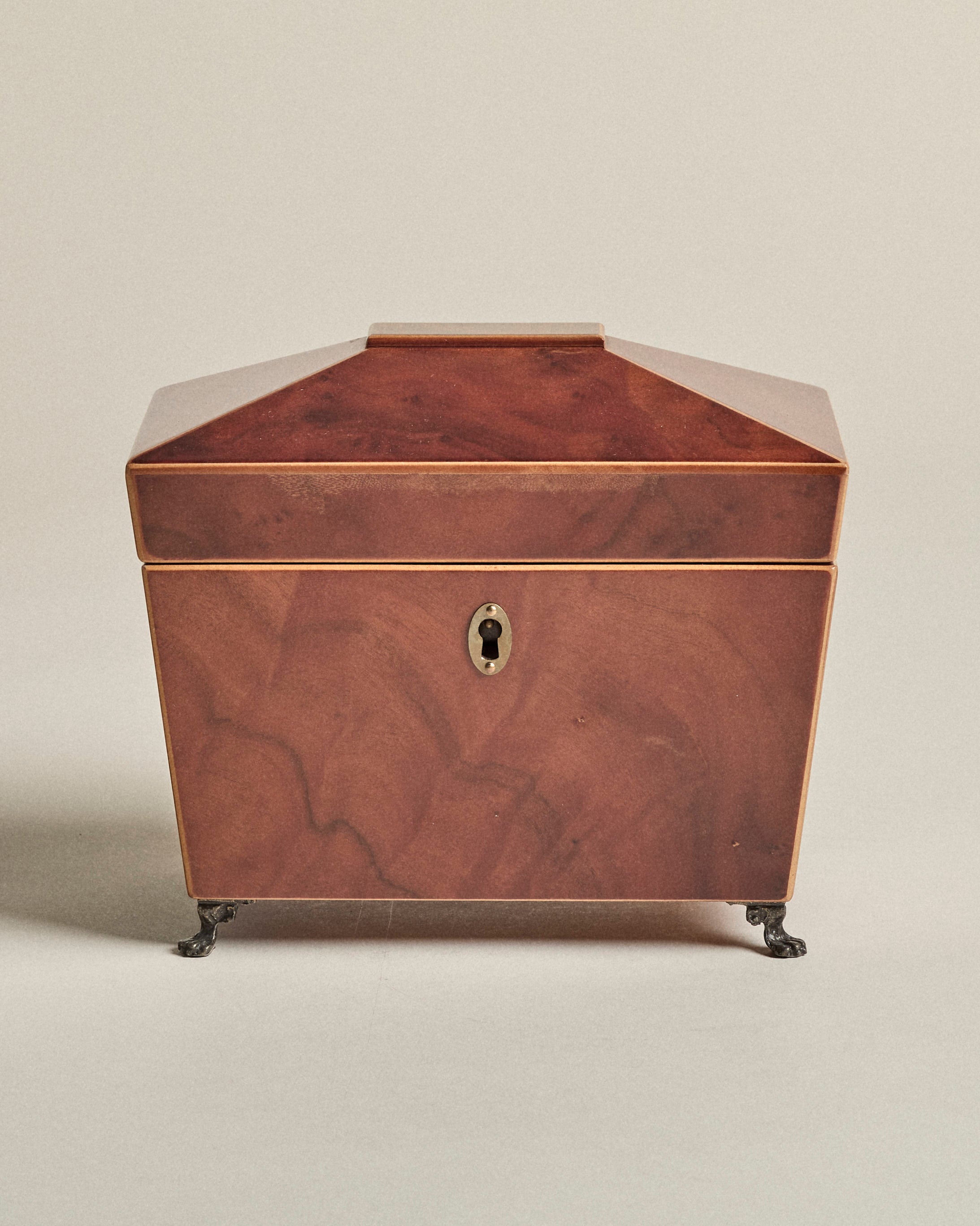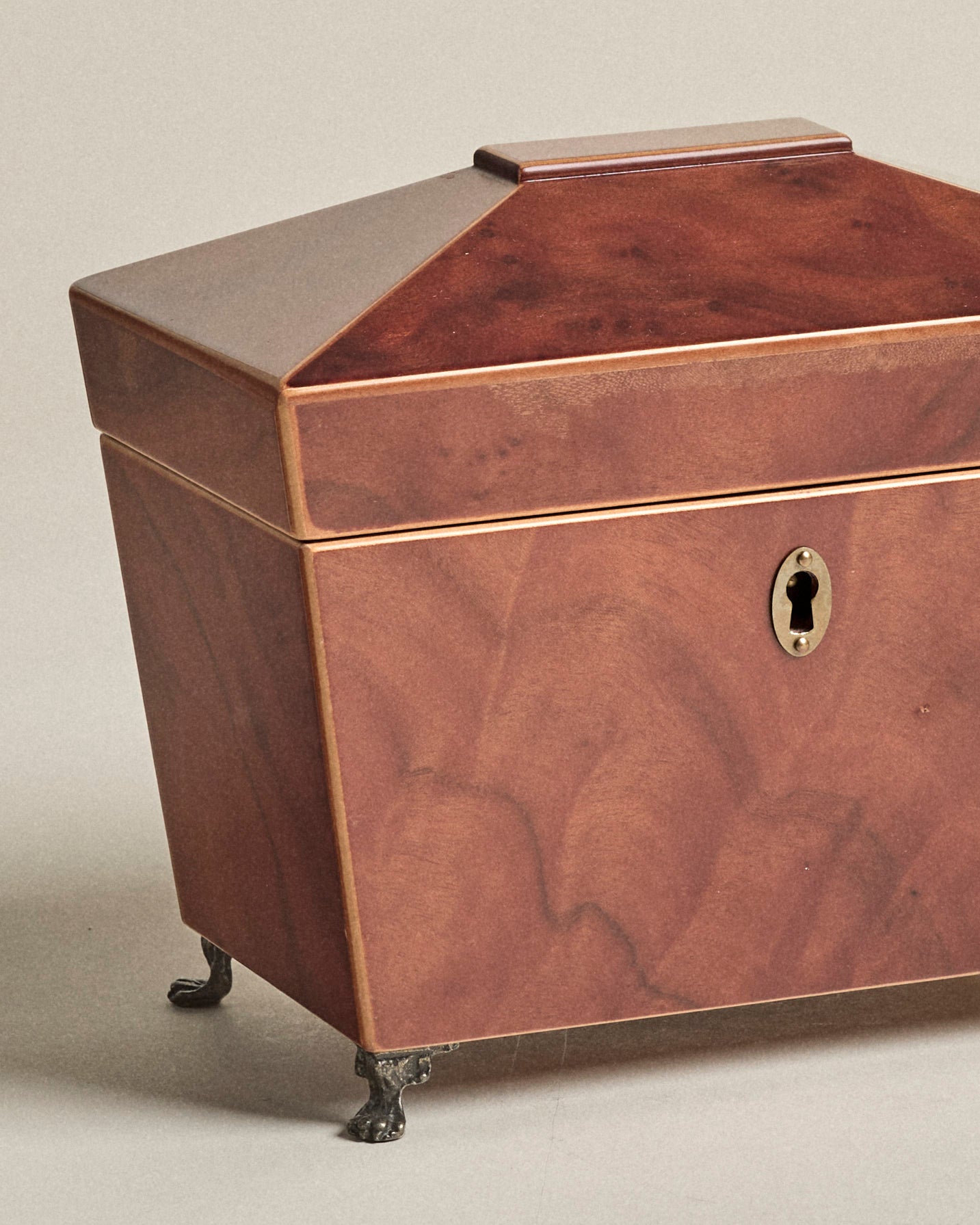 Sarcophagus-form tea caddy in the Georgian style, 20th century. Veneered wood construction with brass edging, fitted keyhole, and claw feet. The architectural silhouette evokes the classical revival tea caddies of the late 18th and early 19th centuries. A decorative and functional piece that captures the elegance of early English tea culture.